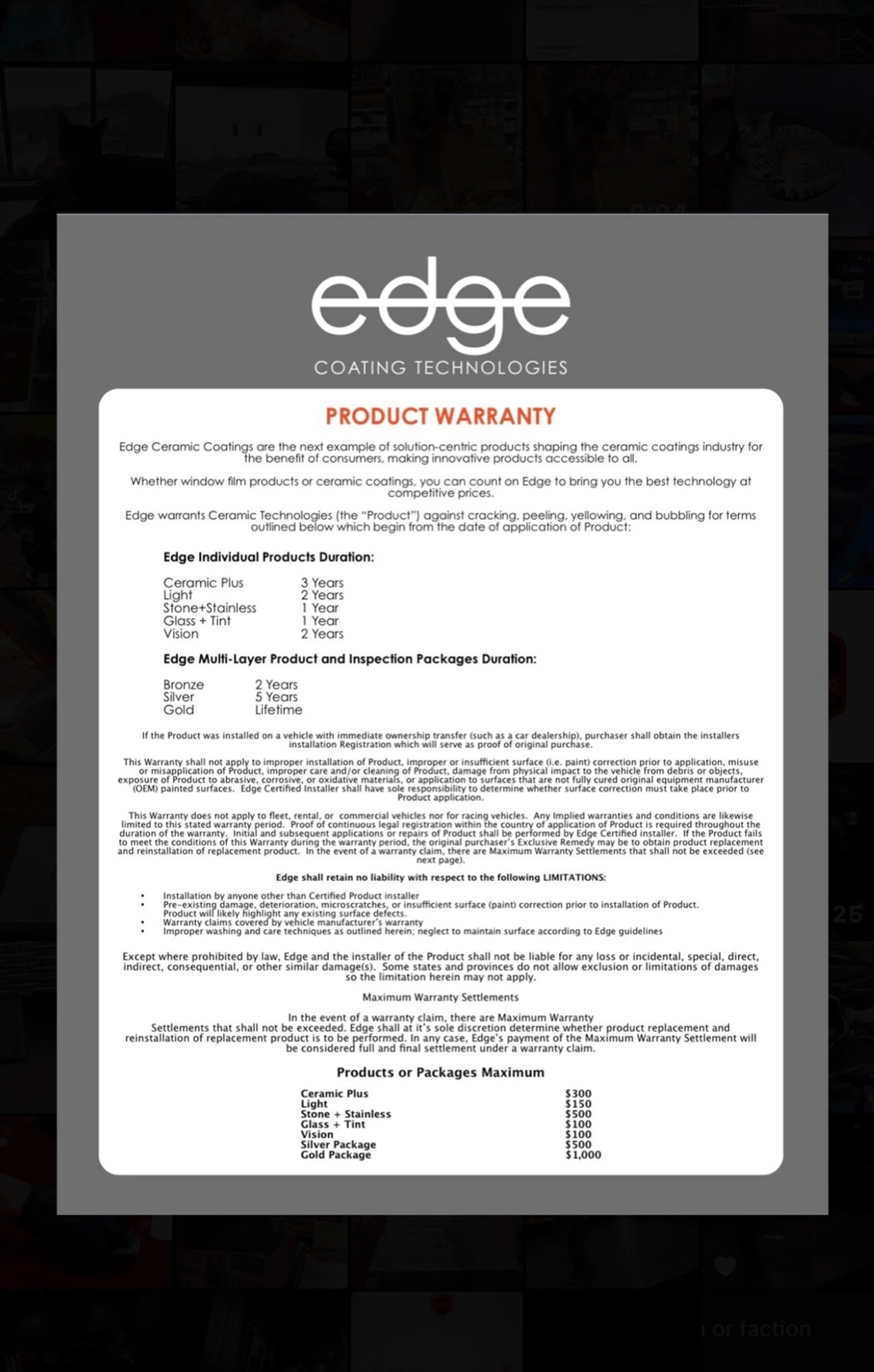 We proudly apply Edge Ceramic Coatings, which come with a warranty against cracking, peeling, or yellowing. Depending on the product, protection ranges from 1 to 3 years. We follow Edge’s certified application standards, ensuring you get lasting, high-quality protection
